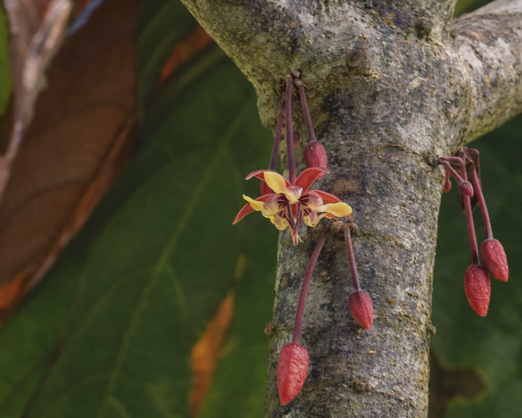 Cacao flowers rely on tiny insects for pollination. While the trees were young, sliced banana plants helped attract these pollinators and support early growth. Care and balance continue to guide how we tend the farm.