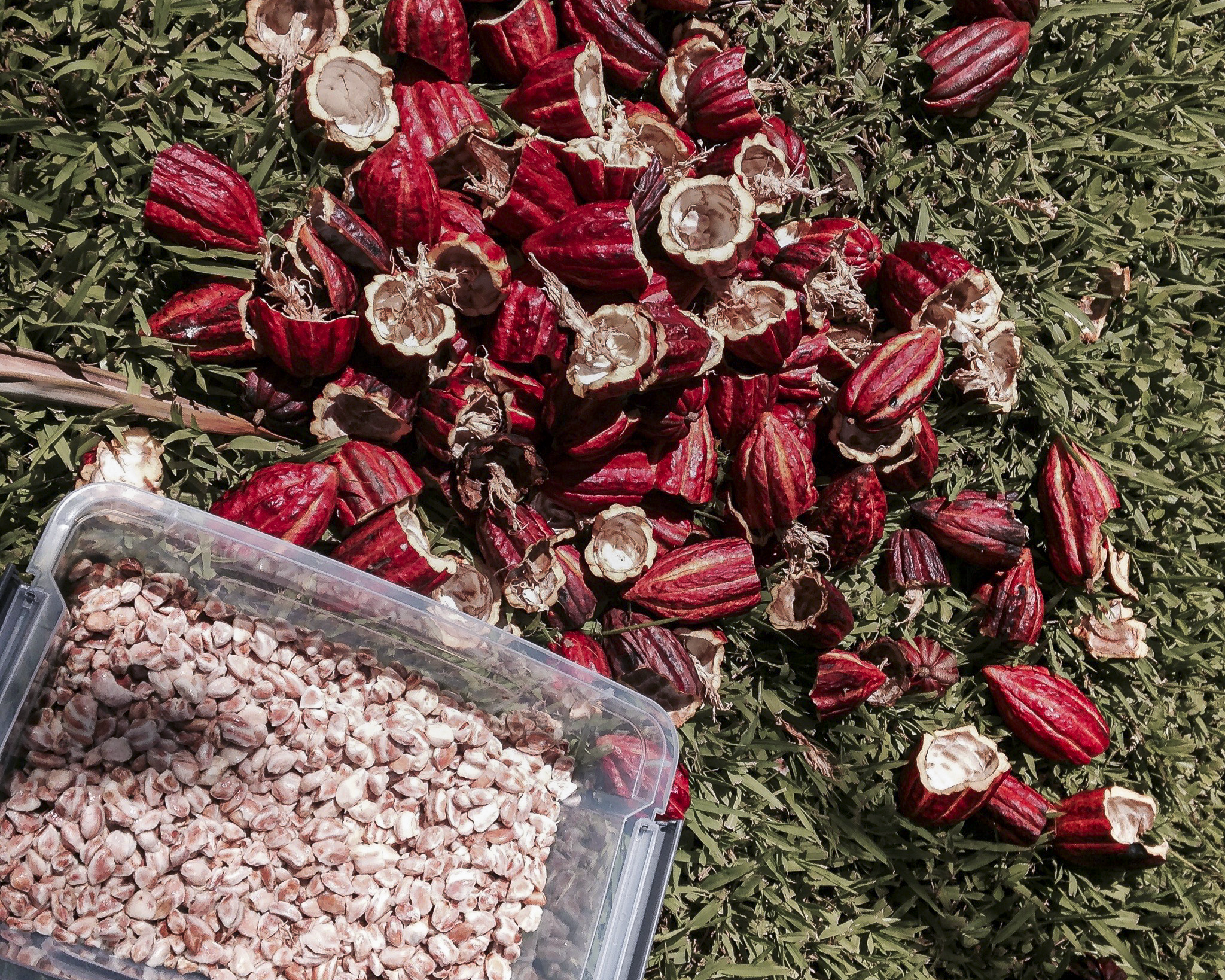 Cacao pods are harvested by hand once they reach peak ripeness. This careful approach protects the trees and ensures only mature pods move forward.